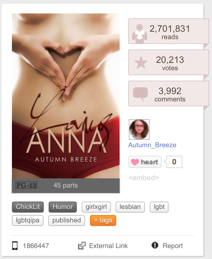Loving Anna cleared 2.7 million reads. That just . . . It blows my mind. I'm not even sure how to respond to the knowledge I am closing in on three million reads. When I hit that number, I might faint. I never saw the story becoming so big. Now it's the most read Lesbian Story on wattpad.